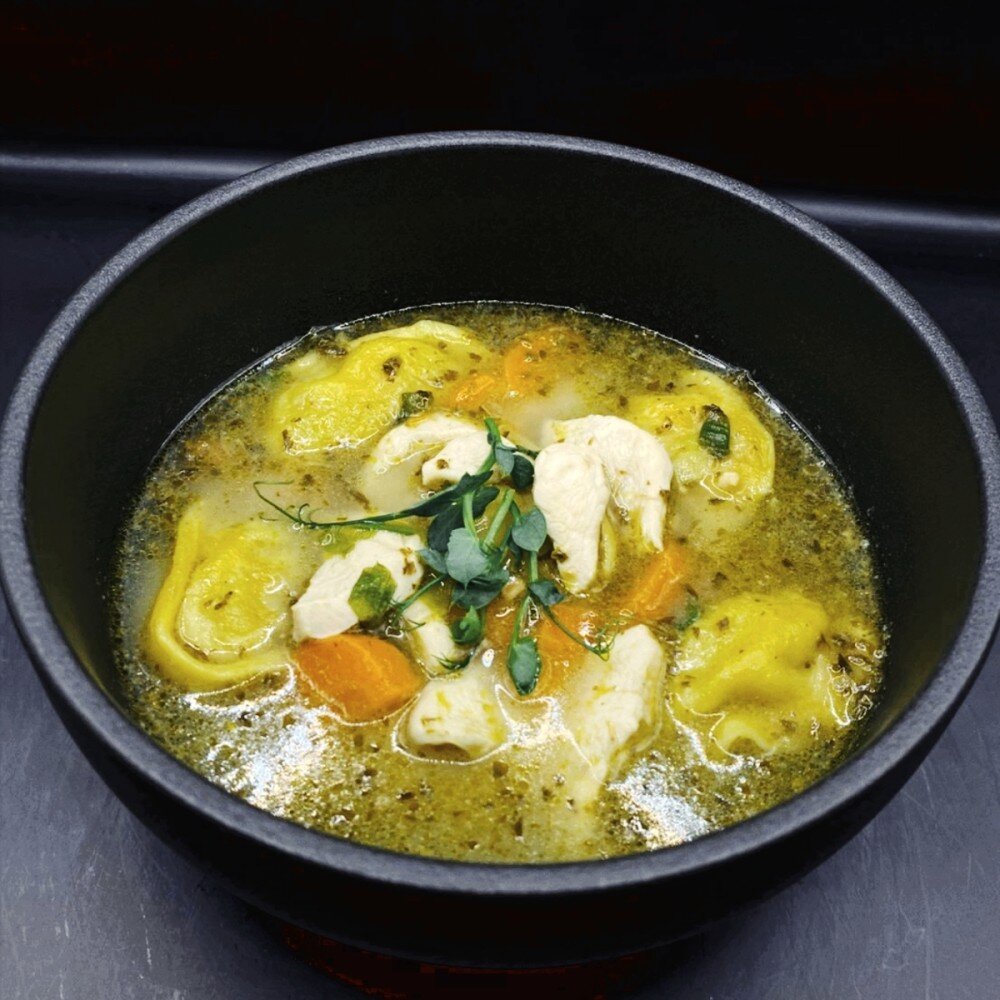 пельмени домашние, филе куриной грудки, морковь, бульон, соус песто, лук зеленый