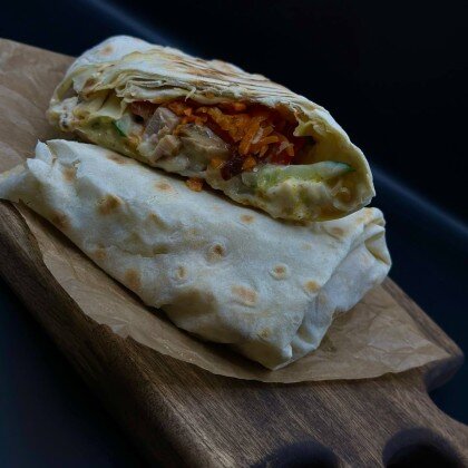 Лаваш, филе куриного бедра, пекинская капуста, свежие огурцы, свежие помидоры, морковь по-корейски, халапеньо, соус сальса, фирменный соус