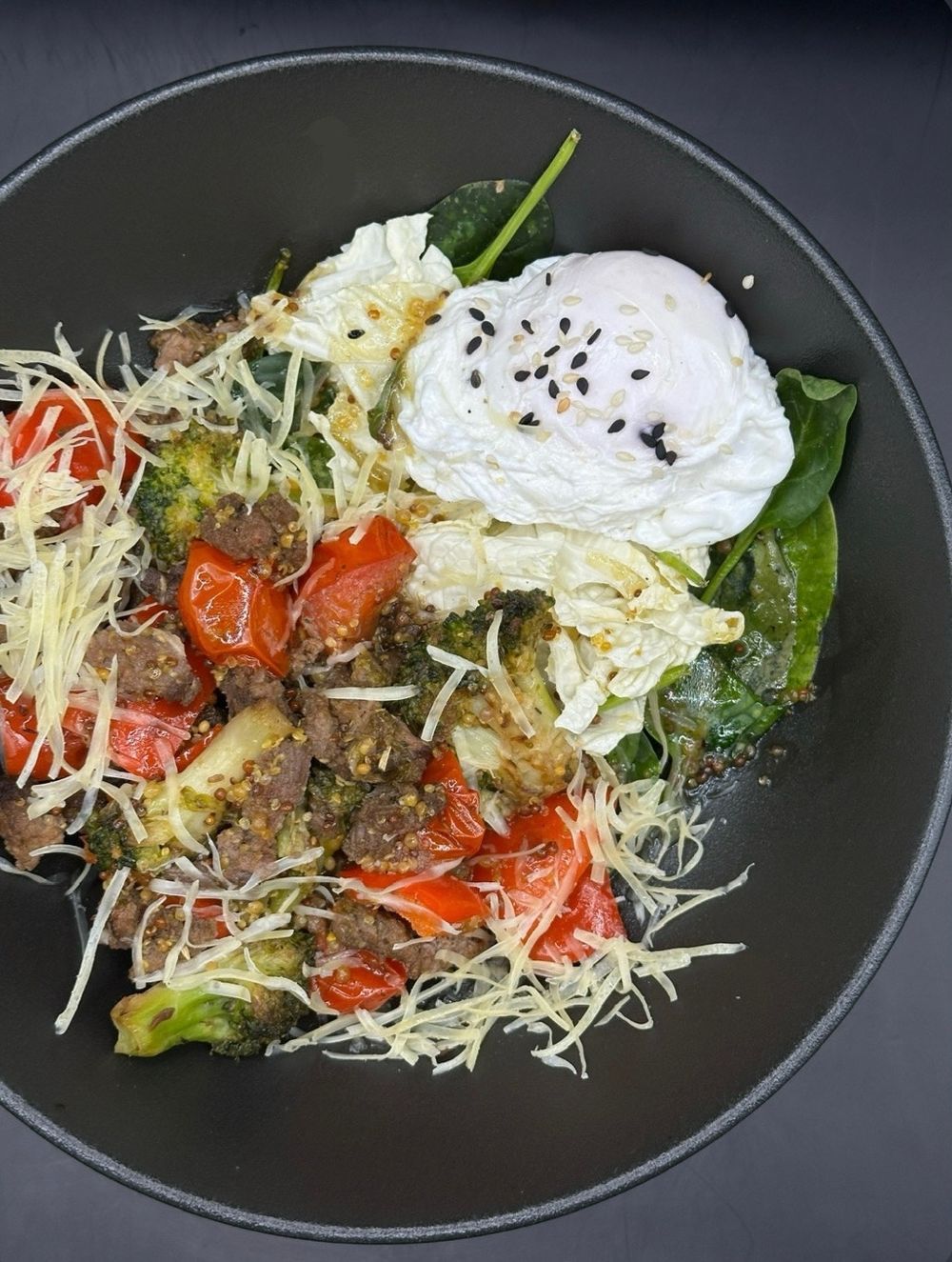 Рваная говядина, перец болгарский, брокколи, черри, пармезан, пекинская капуста, шпинат, яйцо "Пашот", винно-медовая заправка