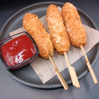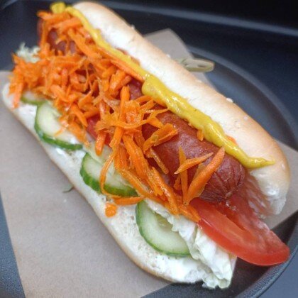 Булочка, сосиска, помидор, маринованный огурец, кетчуп, морковь по-корейски, горчичный соус