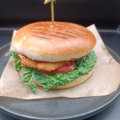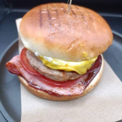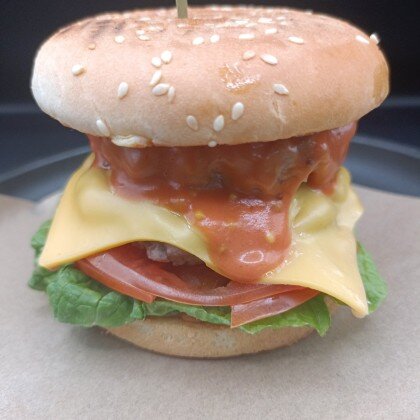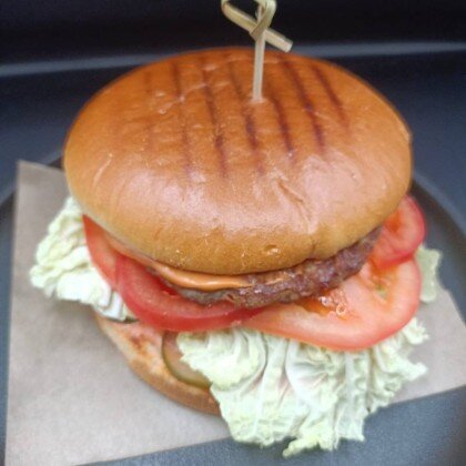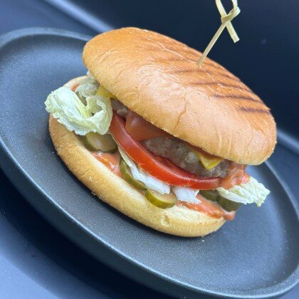 Булка для бургеров, грибная подушка томленная в темном пиве, лист салата, соус, маринованные огурцы, сыр Чеддер, котлета свинина/говядина, халопеньо